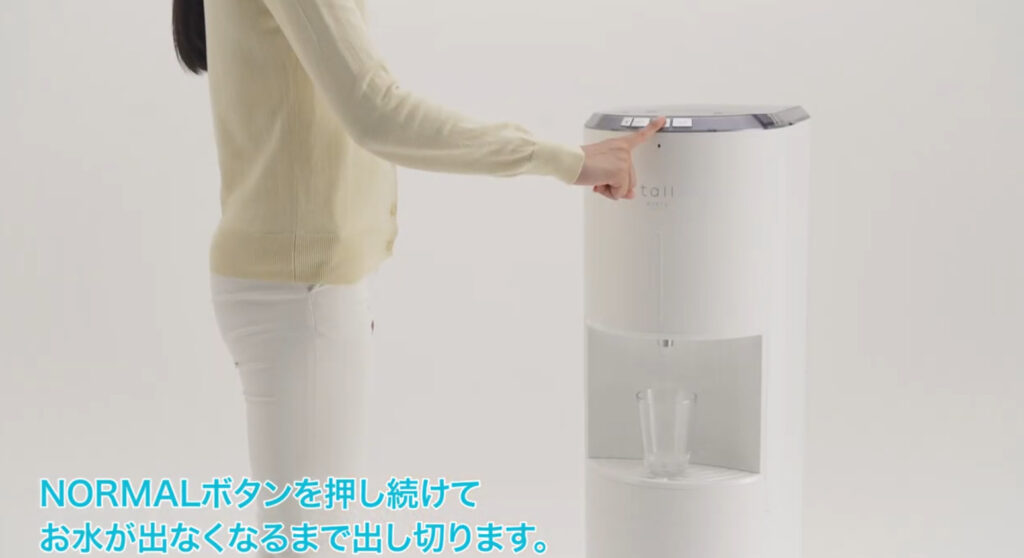 「NORMAL」ボタンを押し続けて、出水口からお水が出なくなるまで、サーバー内部に残った水を排出します(約200ml程度) 。