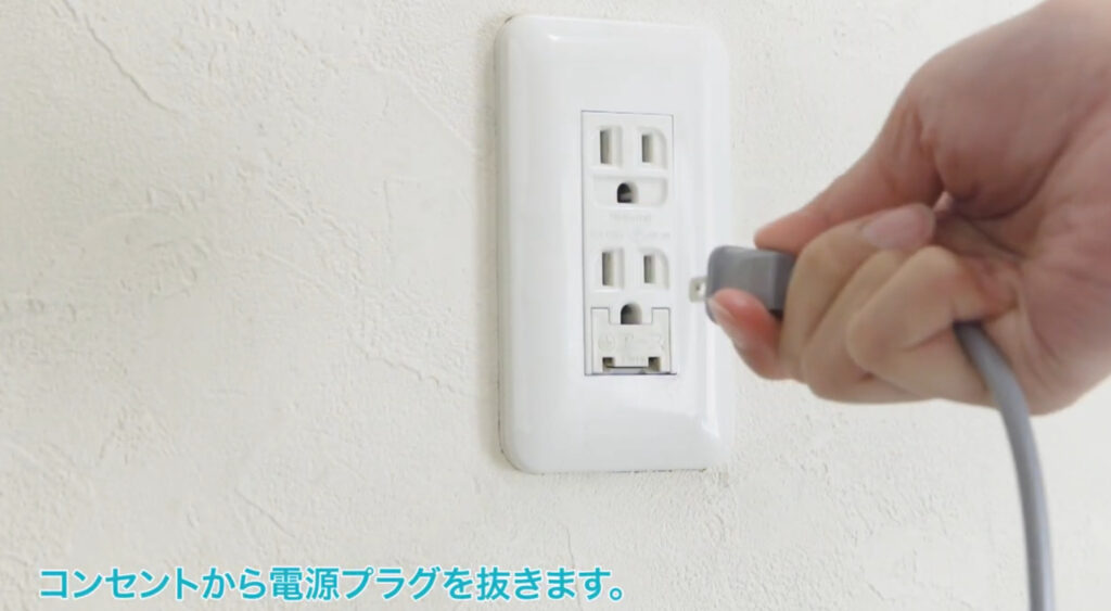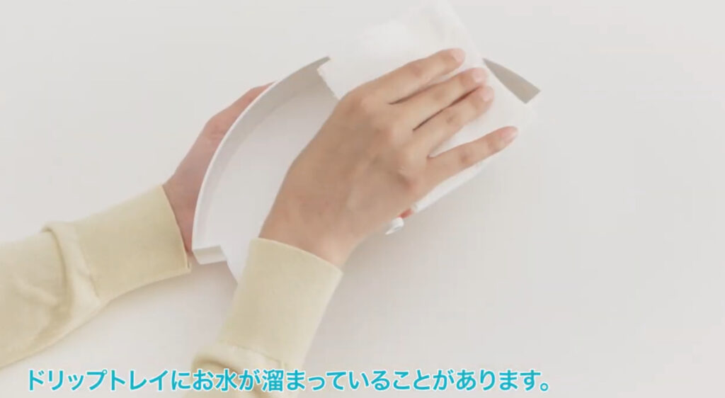 電源プラグをコンセントから抜きます 。ドリップトレイ(水受け皿)にも水が溜まっていることがあるので、取り外してお水を捨て、水気を拭き取ってください 。