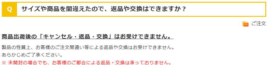 つまり、「サイズを間違えた」「やっぱりいらなくなった」という理由では、たとえ箱を開けていなくても、送料を負担すると言っても、返品は断られてしまいます。