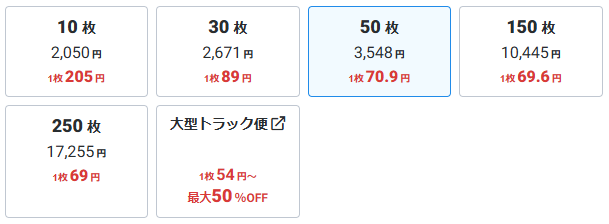 前回ご紹介した「引越しセット」などは、最初からある程度のボリュームがあるため、1枚あたりの単価が安く抑えられています。 「送料無料」の恩恵を最大限に受けるなら、ある程度の枚数を一度に注文するのが鉄則です。