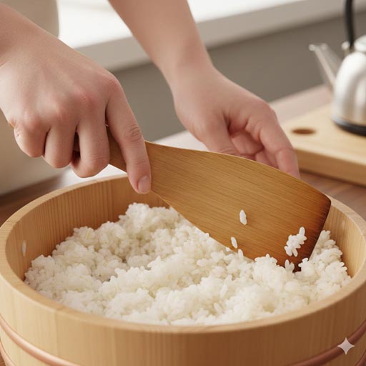 しゃもじをご飯に押し付けるのはNGです。全体にお酢が行き渡ったら、うちわなどで風を当てて急冷します。
