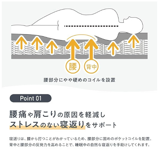 • 構造: マットレスの中央(腰が当たる部分)のコイルを硬く、両端(肩や脚が当たる部分)を柔らかくした「センターハード構造」を採用。