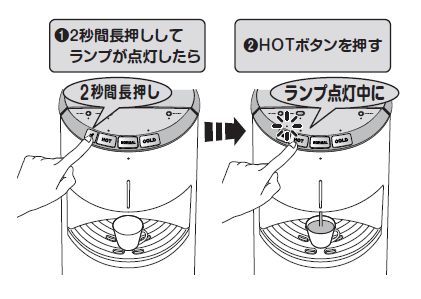 3. ランプが点灯している間に 「HOT」ボタンを押し続ける と、温水が出ます。