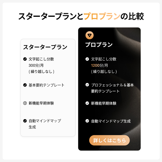 - ヘビーユーザー向け: 文字起こし時間が足りない方や、より高度なAI機能を求める方は「プロプラン」がおすすめ。