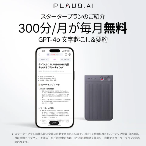 先に結論をお伝えすると、PLAUD NOTEは本体購入後、追加料金なしの「スタータープラン」でAI文字起こしや要約機能を十分に活用できます。