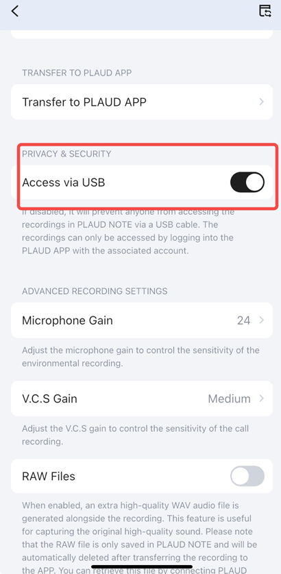 💡 デバイス紛失時に備える物理的なセキュリティ 万が一PLAUD NOTEを紛失しても、第三者がPCに接続してデータを抜き取るのを防ぐ機能があります。アプリの「プライバシーとセキュリティ」設定から、「USB経由でのアクセス」をオフにしておくことで、持ち主以外がUSBケーブルでデータにアクセスできなくなります。
