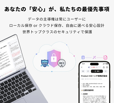 - ユーザー主体のクラウド利用: クラウドへのアップロードは、文字起こし実行時や、ユーザーが明示的にクラウド同期を有効にした場合に限られる。